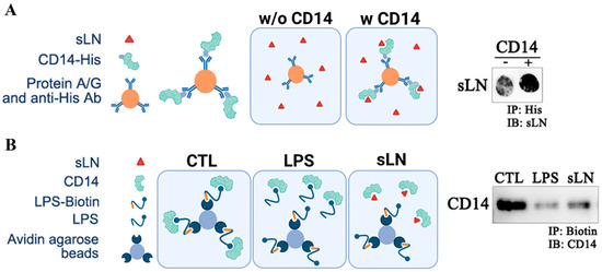 Interaction and immunoprecipitation of sLN and CD14. (A) Schematic on the co-immunoprecipitation of CD14 and sLN and dot-blot showing enrichment of sLN following pull-down with CD14. (B) Schematic demonstrating the competitive co-immunoprecipitation of biotinylated LPS for CD14 in the presence of unlabeled LPS and sLN. Western blot showing the detection of CD14 following the indicated pull-downs. Lanes from left to right: control (CD14 only), LPS-treated, sLN-treated. Original Western blot images are available in Supplementary Materials.