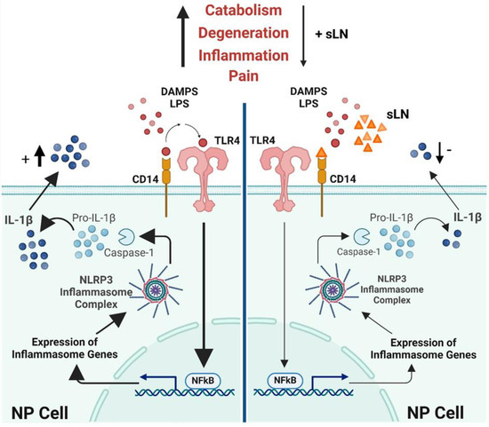 This study builds upon previous research by examining the effects of sLN on inflammasome activity in the IVD, focusing on its interaction with CD14. We hypothesize that sLN inhibits NLRP3 activation in NP cells through CD14 interaction, preventing disc degeneration progression. By elucidating these mechanisms, our research aims to advance therapeutic strategies for discogenic pain and potentially other inflammatory conditions.