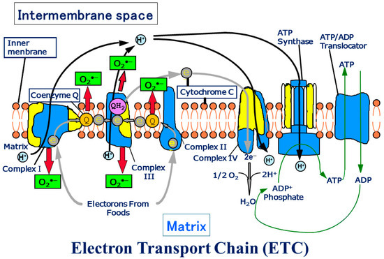 The ETC is composed of over 90 subunits. Among the subunits, yellow is the one translated by the genes in mitochondrial DNA. NADH and FADH2 carry protons (H+) and electrons (e−) to the electron transport chain located in the inner membrane. The energy from the transfer of electrons along the chain transports the protons across the membrane and creates an electrochemical gradient. As the accumulating protons follow the electrochemical gradient back across the membrane through an ATP synthase complex, their movement provides energy for synthesizing ATP from ADP and phosphate. At the end of the electron transport chain, two protons, two electrons, and half of an oxygen molecule combine to form water. Then 2–3% of electrons leak from ETC, and oxygen traps the electrons and becomes superoxide (O2•−). O2•− can change its form to become various reactive oxygen species (ROS) in mitochondria (Figure transferred from Reference [3]).