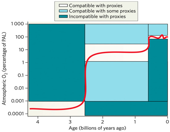Kump described the prevailing view of atmospheric oxygen evolution over time (Figure 4) [11]. The label oxygen in the air was detected as the degree of mass-independent fractionation (MIF) of sulfur isotopes in rocks. The oxygen was not detectable label up to 2.45 billion years; oxygen levels showed 0.001% of the present atmospheric level (PAL). Rocks older than about 2.45 billion years contain a large MIF of sulfur isotopes; rocks older than 2.45 billion years show essentially none. The accumulation of oxygen and sulfate began in the early Proterozoic eon, 2.5 to 0.54 billion years ago [12]. Cyanobacteria and microscopic algae supply oxygen to the atmosphere. Microorganisms may also have played a major role in atmosphere evolution before the rise of oxygen [13]. Lyons et al. suggested a far more dynamic sequence of events, with the possibility of a much larger increase early on, dating from roughly 2.3 to 2.1 Gyr ago, and then a deep plunge to lower levels that extended over a few hundred million years after the onset of the great oxidation event (GOE) [14,15]. The increased oxygen formed free oxygen (O2) and spawned early biological production. The initial increase of O2 in the atmosphere, its delayed build-up in the ocean increases to near-modern levels in the sea and air, and its cause-and-effect relationship with life is among the most compelling stories of Earth’s history [14]. Oxygen has toxicity, and the increased amount of oxygen made cells construct antioxidant systems, such as antioxidant enzymes inside their living organism to fight against the oxidants [2].
