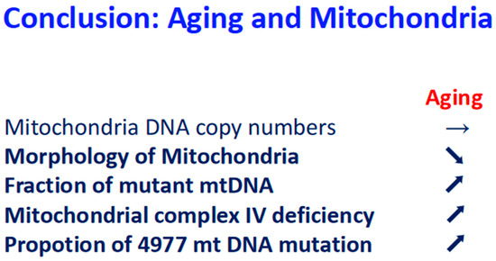 Conclusion: relationship between aging and mitochondria. Upon aging, arrow stable means no change, arrow down means down regulation, and arrow up means up regulation.