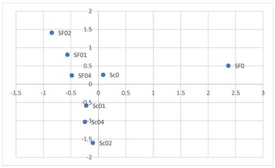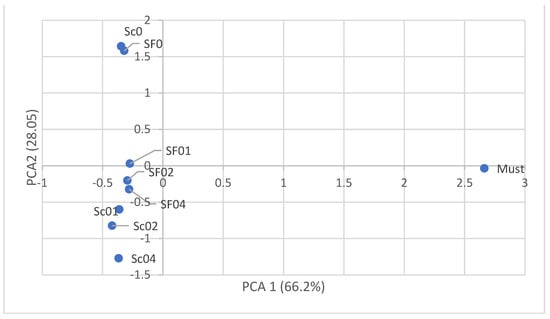 Principal component analysis showing the effect of different CaCl2 additions and types of yeast on the chemical composition of apple musts. SF—spontaneous fermentation; Sc—Saccharomyces cerevisiae SafSpirit HG-1. Doses of CaCl2: 0—0 g/L; 01—0.1 g/L; 02—0.2 g/L; and 04—0.4 g/L.