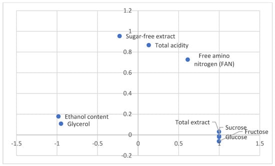 The PCA confirmed that the addition of calcium chloride had a greater effect on the oenological parameters, such as the ethanol concentration, total extract, and fermentation efficiency, than on the type of fermentation used (Figure 2). Moreover, the PCA confirmed that the total extract content is significantly influenced by the glucose and fructose levels (Figure 3). Similarly, the ethanol concentration is related to the glycerol content, and the sugar-free extract content depends on the total acidity and free amino nitrogen concentration.