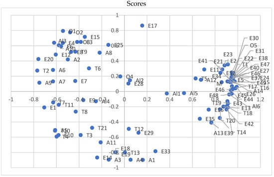 Principal component analysis showing the effect of different CaCl2 additions and types of yeast on the volatile compounds present in apple spirits. Esters (E); Methanol (M); Higher Alcohols (A); Aldehydes and ketones (Al), Terpenoids (T); Other compounds (O). The reference of the compound name to the symbol is summarized in Table 3.