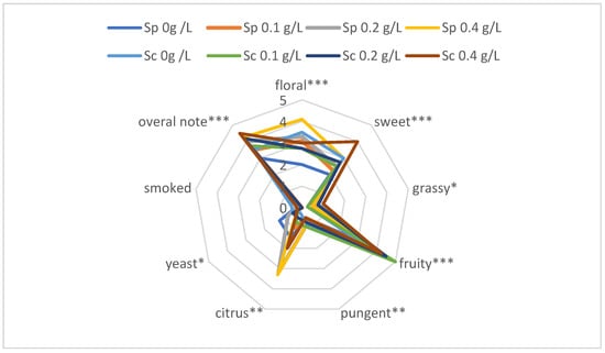 Characteristic aroma features of apple brandies obtained from musts fermented with the addition of CaCl2; n = 5, STD < 5%. Sp—spontaneous fermentation; Sc—Saccharomyces cerevisiae SafSpirit HG-1 (0; 0.1; 0.2; 0.4 g/L—doses of CaCl2 added); *, **, and ***—the significance at 0.05, 0.01, and 0.005 by least significant difference, respectively.