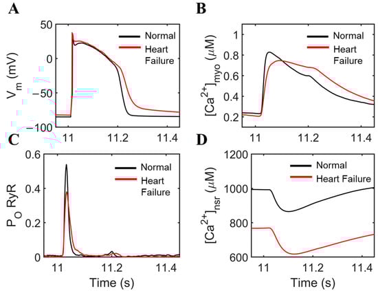 Simulations at 1 Hz pacing displayed APD prolongation and a loss of the distinctive “notch” in the action potential shape during HF similar to the experiment (Figure 1A). Multiple EADs were also observed during a 20 s simulation of heart failure under slow 0.5 Hz pacing (Appendix A Figure A1) which was also demonstrated by Li and colleagues in canine hearts [] where EADs occur more than 40% on average during a slow 0.5 Hz frequency. On the other hand, myoplasmic Ca2+ concentration displays a slower decay due to attenuated sequestration back to the SR due to reduced SERCA function (Figure 1B); a small “notch” can also be observed in HF (red) and this phenomenon was demonstrated in experimental studies [,,]. The RyR open probability shows decrease peak and more dispersed activation late in the AP under HF conditions (Figure 1C) which is further discussed in the next section. Lastly, because SR Ca2+ influx is directly influenced by SERCA in transporting Ca2+ from the myoplasm—the SERCA is impaired in this case—overall levels of SR Ca2+ concentration are decreased (Figure 1D), which can account for the reduced RyR open probability in spite of the increased Ca2+ sensitivity because of RyR phosphorylation. Furthermore, the decreased SR Ca2+ content also reduces the driving force for Ca2+, contributing to the reduced amplitude of the Ca2+ transient (Figure 1B). These results are consistent with the early work of Vermeulen and colleagues [,] using human ventricular trabeculae from patients with terminal heart failure and further simulation studies from Priebe and Beuckelmann [].