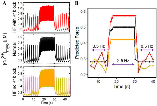 Dynamic slow–rapid–slow pacing (0.5–2.5–0.5 Hz) [Ca2+]myo concentrations between normal, HF with K+ block (i.e., Ito, IK1, IKr, and IKs), and HF without K+ block. To ensure steady state conditions, 45 s simulations were performed. (A) Erratic Ca2+ transient peaks were observed during 0.5 Hz pacing in failing hearts. HF with reduced K+ currents (red) slightly elevated the [Ca2+]myo amplitude during high pacing (2.5 Hz) as compared to normal (black) and HF without K+ reductions (yellow). (B) Predicted force using the same color schemes. HF with reduced K+ currents (red) exhibit higher predicted force using peak systolic [Ca2+]myo concentrations in rapid pacing.
