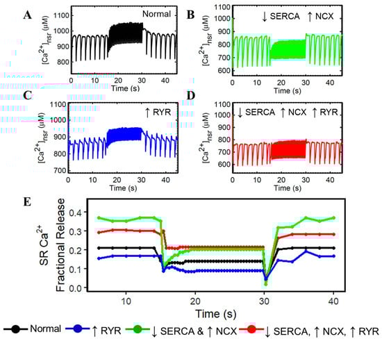 In order to generalize this inference, we applied the same dynamic slow–rapid–slow pacing (0.5–2.5–0.5 Hz) in the network SR with the same isolated mechanisms (Figure 5): normal cardiomyocyte (Figure 5A), decreased SERCA activity and upregulated NCX (Figure 5B), hyperphosphorylated RyR2 (Figure 5C), combination of both cases (Figure 5D), and each of their respective SR Ca2+ fractional releases (Figure 5E). Once again, in all cases except Normal, the K+ changes reflect those seen in HF. On an important note, a diminished Bowditch or staircase phenomenon is a hallmark of heart failure []. This diminished Bowditch effect is observed in Figure 5B,D, largely caused by the downregulated SERCA and upregulated NCX.