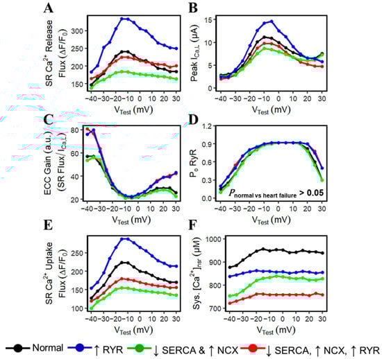 Excitation–contraction coupling gain. (A) The amount of SR Ca2+ release (in µM)—hyperphosphorylated RyR2s (blue) generally increase release flux as compared with impaired SERCA and upregulated NCX (green). (B) Peak ICaL (in µA) observed—upregulation of INCX decreases the amount of Ca2+ current (green). However, as RyR2 is 50% more sensitive, more Ca2+ is released from the SR (blue). (C) ECC gain is altered at negative (−40 mV to −25 mV) and at positive potentials (from 15 mV and above). (D) RyR open probabilities (PO,RyR) are statistically insignificant and are also observed in experimental findings by Jiang et al. in failing canine and human hearts []. (E) A 50% reduction in SERCA activity accounts for the least Ca2+ sequestration into the SR. (F) Systolic SR Ca2+ levels are decreased in HF due to the decreased SR Ca2+ content and other relative HF conditions. The legend on the bottom shows the increase or decrease of the different components.