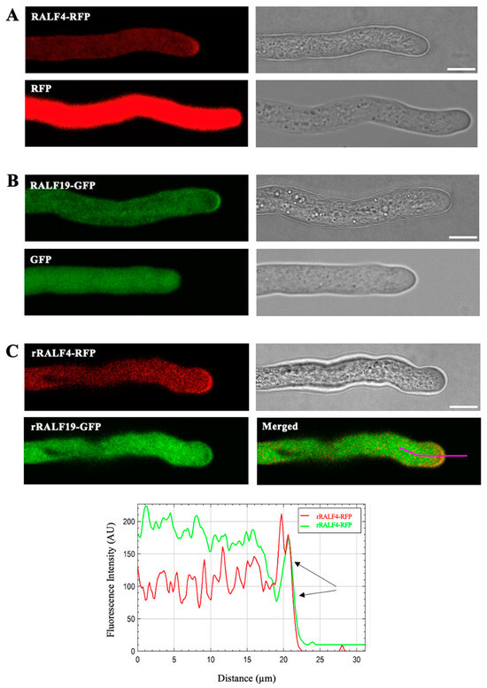 Here, we show that RALF4-RFP and RALF19-GFP peptides colocalize in the pollen tube tip region. This result agrees with the report of Zhou and colleagues [26] that shows that RALF4-GFP is secreted to the apoplast of the pollen tube tip, and with Mecchia et al., 2017 [15], which shows that synthetic peptides FITC-RALF4 and FITC-RALF19 bind to pollen tubes, with a more intense signal at the tip periphery.