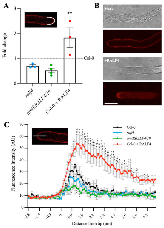 The regulation of the cell wall integrity in pollen tubes is essential for the control of their polar growth. In order to determine how RALF4 influences the cell wall, the levels of pectin, one of the main components of the pollen tube cell wall, were analyzed. For this, pollen tubes from ralf4, amiRRALF4/19 and Col-0 plants, with or without previous incubation with the synthetic RALF4 peptide, were germinated in vitro and treated with propidium iodide (PI), which stains de-methylated pectins through binding to the carboxylic residues of non-carboxylated homogalacturonans [19]. The fluorescence intensity of PI was measured along the perimeter of the apical and subapical regions (Figure 2A) and along the pollen tube by tracing a longitudinal line from the tip into the cytoplasm (Figure 2C). Whereas amiRRALF4/19 and, to a lesser extent, ralf4 pollen tubes displayed a decrease in PI fluorescence intensity in the tip region, the RALF4 treatment led to a significant increase in PI fluorescence in wild-type pollen tubes (Figure 2B). This result suggests that, in wild-type pollen tubes, RALF4 participates positively in the deposition of pectin in the tip cell wall, necessary for the proper polar growth of pollen tubes.