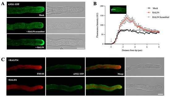 It has been previously proposed that apoplastic RALF4 interacts with the extracellular domains of the receptor kinases ANX1/2 and BUPS1/2, activating a signaling cascade that controls pollen tube integrity and growth [5,15]. ANX1 overexpression was shown to inhibit pollen tube growth by triggering the overactive deposition of plasma membrane and cell wall material at the tip [11]. To study whether ANX1 localization is modified after the incubation with its ligand RALF4, pollen from an anx1 anx2 double-mutant line complemented with ANX1-YFP [11] was germinated in vitro. ANX1-YFP was enriched at the plasma membrane of the pollen tube tip and also in particulate structures in the apical cytoplasm (Figure 3A and Figure S4), as previously described [11]. When the anx1 anx2 pollen tubes expressing ANX1-YFP were treated with 250 nM RALF4, a region about 2 to 5 µm away from the tip showed higher fluorescence levels of ANX1-YFP than in the RALF4 scrambled or mock controls (Figure 3A,B and Figure S4). As already described [11], membrane invaginations were also observed in some pollen tubes treated with RALF4 (n = 14 out 23) but neither in tubes treated with the RALF4 scrambled peptide (n = 0 out 23) nor in mock-treated tubes (n = 0 out 26; Figure S4). In addition, staining with the lipophilic dye FM4-64 reveals that, in the RALF4-treated pollen tubes, ANX1-YFP remained in membranous elements in the tip, as it co-localized with FM4-64 (Figure 3C).