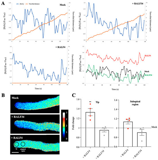 Cytoplasmic hydrogen peroxide levels in RALF4-treated pollen tubes. Col-0 pollen tubes expressing the cytosolic H2O2 sensor HyPer1 were used. (A) The distance traveled by the tip of a pollen tube (orange) and hydrogen peroxide levels in the cytoplasm of the tip region (blue) were measured over time after the addition of PGM (Mock) (upper left), RALF34 (upper right) or RALF4 (lower left). The lower right panel includes all H2O2 curves together to appreciate the differences. (B) Representative images of the tubes displaying the HyPer1 ratio (F488/F405) at the tip and subapical region. Scale bar: 10 µm. A representative pollen tube for each treatment is shown in (A,B). (C) Quantification of the HyPer1 ratio at the tip (left panel) and subapical region (right panel) of growing Col-0 pollen tubes after PGM (mock), RALF34 or RALF4 treatments. Data are shown as the mean ± SD of the fold change of the ratio obtained with RALF4 and RALF34 treatments with respect to mock, for four independent experiments. For each experiment, fluorescence was recorded in a 4 µm circular ROI every three seconds for three minutes, for seven to 11 pollen tubes per treatment. Double asterisks indicate a significant difference in comparison to mock treatment, according to one-way ANOVA test followed by a Tukey test (** p < 0.01).