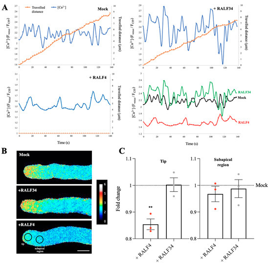 Cytoplasmic calcium levels in RALF4-treated pollen tubes. Col-0 pollen tubes expressing the cytosolic calcium sensor Yellow Cameleon 3.6 (YC3.60) were used. (A) The distance travelled by the tip of a pollen tube (orange) and the calcium levels in the cytoplasm of the tip region (blue) were measured over time after the addition of PGM (Mock) (upper left), RALF34 (upper right) and RALF4 (lower left). The lower right graph shows all H2O2 curves together to appreciate the differences. (B) Representative images of the tubes displaying the ratio FCFP/FYFP at the tip and subapical region after the treatments. Scale bar: 10 µm. A representative pollen tube for each treatment is shown in (A,B). (C) Quantification of YC3.60 ratio (FCFP/FYFP) at the tip (left panel) and subapical region (right panel) of the pollen tubes after the treatments. Data are shown as the mean ± SD of the fold change of the ratio obtained with RALF4 and RALF34 treatments with respect to mock, for three independent experiments. For each experiment, fluorescence was recorded in a 4 µm circular ROI every three seconds for three minutes, for seven to eight pollen tubes per treatment. Double asterisks indicate a significant difference in comparison to mock treatment, according to one-way ANOVA test followed by a Tukey test (** p < 0.01).