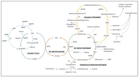Methionine is one of the essential amino acids that are not synthesized in the mammalian system [28]. Therefore, an indispensable source of methionine is from our diet [9,29]. Methionine enters cells via different methionine transporters (like SLC1A5, SLC7A5, SLC7A8, SLC7A6, SLC7A7, SLC38A1, and SLC38A2) [30]. This amino acid (methionine) is not only used for protein formation but is also metabolized through the methionine cycle, as shown in Figure 2. In the first step of the methionine cycle, methionine adenosyltransferase (MAT) converts methionine to S-adenosylmethionine (SAM) with the use of one ATP [30,31]. Interestingly, SAM is the only methyl donor that gives a methyl group to nearly all methylation reactions in the body [32]. After transferring the methyl group via various transmethylation reactions with the help of different methyltransferases (such as DNA methyltransferases, histone methyltransferases, etc.), SAM irreversibly converts to S-adenosylhomocysteine (SAH or AdoHcy) [33]. SAH is the metabolic precursor of homocysteine (Hcy) and also acts as a negative regulator of all methyltransferases mentioned above [34]. Then, SAH is reversibly hydrolyzed to Hcy and adenosine (Ado) by SAH hydrolase (AHCY or SAHH) [35]. It is important to notice that the hydrolysis of SAH to Hcy and adenosine is the only reversible reaction in the cycle. Thermodynamically, it favors the condensation of Hcy and adenosine to SAH. However, this cycle can only proceed if Hcy is efficiently removed or transformed [36]. High total Hcy levels (>15 μmol/L) in plasma, also known as hyperhomocysteinemia (HHcy), have been associated with various types of diseases, including cancer [11,31,37]. After the production of Hcy, it bifurcates into the transsulfuration and remethylation pathways [38]. In normal physiological conditions, 50% of Hcy goes to the transsulfuration pathway, and another 50% of Hcy is re-methylated back to methionine with the help of methionine synthase (5-methyltetrahydrofolate-homocysteine methyltransferase; MTR or MS) or betaine-homocysteine methyltransferase (BHMT) to complete the methionine cycle (Figure 2) [15]. There are different forms of Hcy found in blood circulation, which consist of around 1% as free thiol, 70–80% present and bound to plasma proteins, and the remaining 20–30% present as forms homo/heterodimerized with other thiols [15]. Due to its exceptionally low pKa of 6.7, Hcy-thiolactone remains mostly neutral in the blood and is primarily cleared by the kidneys (~1% is reabsorbed, and over 95% is excreted by the kidneys) [39]. In the transsulfuration pathway, Hcy converts to cystathionine with the help of cystathionine-β-synthase (CBS); cystathionine is then converted to cysteine by cystathionine γ-lyase (CSE) for the production of glutathione (GSH) [40]. In both of these conversions (Hcy to cystathionine and cystathionine to cysteine), H2S is produced as a byproduct, which has recently been shown to have an antioxidative, anti-inflammatory, and anti-apoptotic role in our body [41]. In addition to methylation reactions, SAM can also be used for polyamine synthesis, as shown in Figure 2. During polyamine synthesis, S-methyl-5′-thioadenosine (MTA) is produced as a byproduct, which can be further recycled back to methionine via the salvage pathway [42,43].