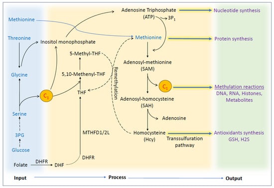 Schematic representation showing the inputs of 1C units from dietary sources and their processing and utilization in different biosynthesis processes as output. In this process, methionine, glucose, serine, and glycine can be used as inputs to carry over 1C metabolism. Serine can be obtained from the diet or produced from glucose via the de novo process. Folate from the diet is converted to THF, which accepts a 1C unit during the folate cycle. Then, serine is broken down into glycine, producing a 1C unit which combines with THF to form methylene-THF. Methionine from the diet can be used to produce SAM, which is subsequently used for methylation reactions and cellular antioxidant production. Different outputs from 1C metabolism also act as building blocks for the cellular biosynthesis of DNA, RNA, and protein.