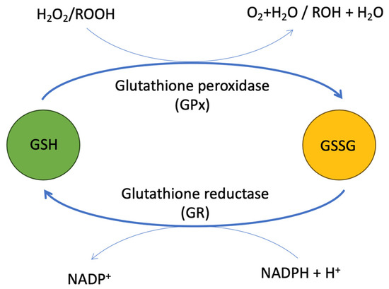 During the process of electron transfer through the respiratory chain in oxidative phosphorylation, mitochondria play a crucial role in managing reactive oxygen species (ROS). To effectively prevent this ROS (O2•−, OH, HOO•, H2O2) from leaking into the cytosol and causing potential harm, mitochondria utilize an antioxidant defense system for ROS scavenging. Different antioxidant enzymes like catalase, peroxiredoxin (Prx), and glutathione peroxidase (GPx) convert these ROS into harmless oxygen and water. After reacting with H2O2, Prx is reduced back to its functional form through its interaction with thioredoxin (Trx), while oxidized GPx is mainly reduced by glutathione (GSH) [82]. Although GSH is oxidized to glutathione disulfide (GSSG), the enzyme glutathione reductase (GR) ensures the regeneration of GSH from GSSG with the help of nicotinamide adenine dinucleotide phosphate (NADPH) (Figure 4) [83]. The balance of the intracellular redox status is effectively measured by the GSH/GSSG ratio. In healthy conditions, this ratio typically exceeds 100, but it is known to decline to 10 or less during oxidative stress [84,85]. This dynamic regulation highlights how 1C flux also maintains redox homeostasis via GSH production.