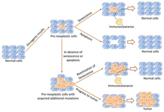 Schematic representation of the fate of cells undergoing senescence and apoptosis upon oncogenic insults. In response to various stressors, normal cells with pre-neoplastic lesions may undergo senescence or apoptosis with the final goal of removing the pre-neoplastic cells. However, in the absence of these antiproliferative responses, pre-neoplastic cells continue to grow and acquire additional oncogenic mutations. At this step, senescence can be reactivated, or it can progress toward malignant transformation.