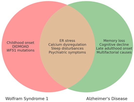 Numerous studies have shown the key role that the WFS1 gene plays in both WS1 and certain neurodegenerative and psychiatric disorders, particularly AD. While WS1 and AD are distinct diseases, they share important molecular mechanisms, including disruptions in ER homeostasis, alterations in calcium regulation, and increased ER stress, all of which contribute to neurodegeneration in both conditions. In both cases, the absence or reduced expression of WFS1 leads to severe neuronal and psychiatric damage. Nevertheless, it is crucial to ascertain whether these shared mechanisms are primary disease drivers or convergent cellular responses specific to each disorder. If the mechanisms behind WS1 and AD are mechanistically similar, WS1 models could help AD research, and vice versa. However, unique cellular alterations in each disease might require condition-specific therapeutic adaptations.