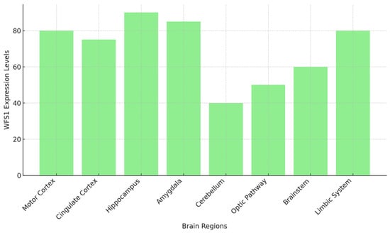 The expression levels of WFS1 differ in different brain regions. Regions such as the hippocampus, amygdala, limbic system, and motor cortex show high WFS1 expression, highlighting its role in memory, emotional regulation, and motor coordination (Y-axis: expression level in arbitrary units) [26,27,28,29].