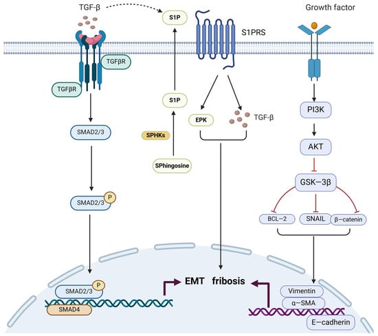 The fibrosis-related signaling pathways mentioned above. Created in BioRender. Hy, Z. (2024) https://BioRender.com/b09f513 (accessed on 1 November 2024). Legend: the red lines represent inhibitory effects. PI3K, phosphoinositide-3 kinase; GSK-3β, Glycogen synthase kinase-3; SphKs, sphingosine kinases; S1P, Sphingosine 1-phosphate; α-SMA, α-smooth muscle actin.