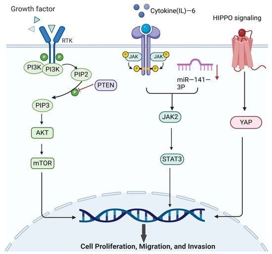 Activation of the Hippo signaling pathway under physiological conditions can inhibit cell proliferation and migration and EMT and promote cell apoptosis. Yes-associated protein (YAP), a key downstream protein of the Hippo pathway, plays an important role in regulating cell proliferation and apoptosis and tissue metabolism []. YAP inhibitors have confirmed that inactivation of the Hippo signaling pathway in adenomyosis promotes proliferation, migration, and EMT occurrence []. By specifically targeting YAP1, researchers have observed improvements in progesterone resistance and an increase in PR expression, marking a significant advancement in adenomyosis treatment strategies []. Undoubtedly, the upstream and downstream molecules of the PI3K/AKT/mTOR, JAK/STAT, and Hippo signaling pathways are potential targets for adenomyosis treatment (Figure 3). However, experiments targeting these therapeutic strategies have focused on preclinical animal models; high-quality clinical trials are needed to support their clinical application.