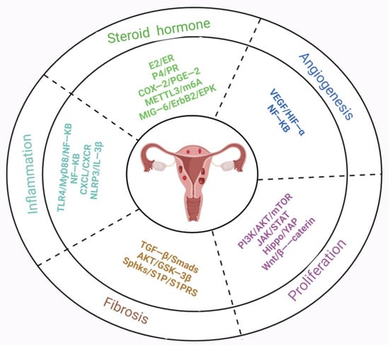 Cell signaling pathways participating in regulating pathological processes of adenomyosis. Created in BioRender. Hy, Z. (2024) https://BioRender.com/r27b722 (accessed on 31 October 2024).