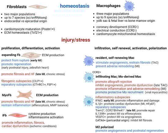 Main features of cardiac fibroblasts and macrophages. Major fibroblast and macrophage populations determine critical components of cardiac structure and function in homeostasis. Following injury, both compartments significantly change by proliferation, differentiation, activation, or recruitment of additional subsets from extracardiac resources. Depending on the condition and time point post injury (early vs. late), specific subpopulations may exert detrimental (red) or beneficial (blue) actions, further inhibiting or promoting, respectively, cardiac repair and regeneration. Fbs—cardiac fibroblasts; iFbs—inflammatory fibroblasts; MyoFbs—myofibroblasts; ECM, MMPs—extracellular matrix and metalloproteases, respectively; MI, TAC, HF, HFpEF—experimental models of myocardial infarction, thoracic aortic constriction, heart failure, and heart failure with preserved ejection fraction, respectively. sc/snRNASeq—single cell/single nucleus RNA sequencing. For the rest of the abbreviations and details, see text. Created with BioRender.com.