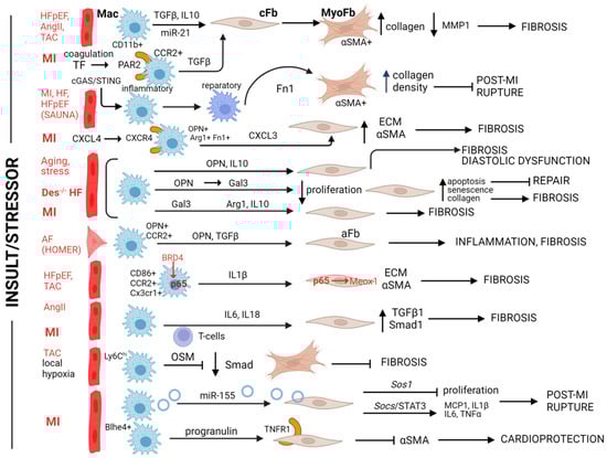 Macrophage-mediated effect on fibroblasts regulating cardiac repair and fibrosis. Depending on the insult/stress, primarily affecting ventricular or atrial cardiomyocytes (left side, in red), and pathways activated, macrophage subsets respond by altering their status and/or by secreting mediators that either promote (arrows with heads) or inhibit (arrows blunted) fibroblast activation, altering pathways regulating differentiation, ECM production, and cell survival. Depending on the pathology and the time point examined, this may support a beneficial (repair, inhibition of myocardial wall rupture) or a detrimental (fibrosis, promotion of myocardial wall rupture, cardiac dysfunction) outcome, crucial for heart failure (HF) development. Macs—macrophages; cFb—cardiac fibroblasts; aFbs—atrial fibroblasts; MyoFbs—myofibroblasts; MI, AngII, TAC, AF—myocardial infarction, AngII infusion, thoracic aortic constriction, and atrial fibrillation, respectively. HOMER, SAUNA, des−/−—animal models of cardiac injury and HF. For the rest of the abbreviations and details, see text. Created with BioRender.com.