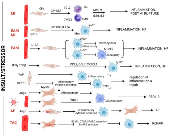 Fibroblast-mediated effects on macrophages regulating cardiac repair and fibrosis. Depending on the insult/stress, primarily affecting cardiomyocytes (left side, in red) and pathways activated, fibroblasts respond by altering their status and function, including differentiation into myofibroblasts, and/or by secreting mediators that either promote or inhibit the recruitment, activation, and differentiation of macrophages (and other innate immune cells). This, in turn, may affect the cardiac outcome promoting or inhibiting cardiac repair, fibrosis, and dysfunction depending on the pathology and the time point examined. Arrows with heads—induction; arrows blunted—inhibition; cFbs—cardiac fibroblasts; MyoFbs—myofibroblasts; Macs—macrophages; Mos—monocytes; PMNs—neutrophils; MI, EAM, AngII, Virus, AF, TAC—myocardial infarction, experimental autoimmune myocarditis, AngII infusion, viral myocarditis, atrial fibrillation, and thoracic aortic constriction, respectively. For the rest of the abbreviations and details, see text. Created with BioRender.com.
