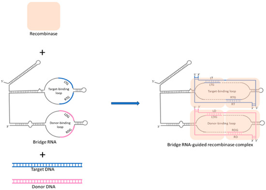 Recently, in 2024, a novel RNA-directed editing methodology, termed bridge RNA-guided recombination systems, was characterized in Escherichia coli [20,88]. This system comprises a recombinase protein that interacts with a guide RNA, akin to the CRISPR-Cas9 mechanism, and the guide RNA specifies two DNA sequences: one for the genomic target site to be altered and the other for the DNA site to be changed. This system utilizes dual-binding loops to facilitate highly specific DNA recombination without introducing double-strand breaks, thus potentially minimizing mutagenic risks. Mechanistically, the bridge RNA confers modular specificity to recombinase enzymes for targeted DNA by using dual-binding loops that recognize and bind to specific sequences in both target and donor DNA, thereby directing precise DNA recombination events, as shown in Figure 2. Excitingly, recent research also confirmed that target-binding and donor-binding loops can be independently reprogrammed to direct sequence-specific recombination between two DNA molecules, which means that bridge RNA-guided recombination systems may offer a unified system for complex genome editing such as precise insertion, excision, and inversion of DNA sequences [20]. Therefore, this system has the potential to broaden the scope and variety of nucleic acid-guided therapeutic approaches beyond CRISPR. Although the efficiency and safety of this system in more complex biological systems remain unclear, the ongoing further research from in vivo studies in eukaryotic cells will pave the way for transforming into an efficient tool for gene editing. Thus, due to its unique advantages compared to CRISPR/Cas9, the bridge RNA-guided recombination system is expected to become the next milestone in the field of gene editing.