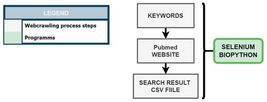 KnowVID-19 employs a web crawling methodology, as illustrated in Figure 2, to systematically gather information from crucial biomedical online sources, specifically targeting PubMed and PMC. A Python-based web crawler was developed utilizing Selenium (https://selenium-python.readthedocs.io/, accessed on 3 November 2024) and BioPython (https://biopython.org/) libraries to extract publications from these databases based on predefined search terms and strings (as mentioned in Section 2.1.1).