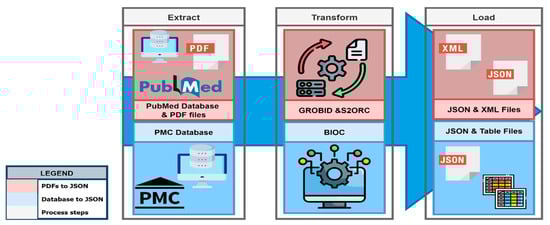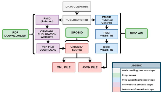 For PMID publications, tools like GROBID (https://github.com/kermitt2/grobid, all web accessed on 3 November 2024) (GeneRation of Bibliographic Data—a ML library) and S2ORC (https://github.com/allenai/s2orc) [5] (Semantic Scholar Open Research Corpus) are utilized to extract and structure the information from scholarly documents; the BioC (https://bioc.sourceforge.net/) [6] API is employed to extract and structure the information from PMCID publications. The transformed data formats are easy to preprocess text and/or data, making it easier to integrate the data into diverse programs and systems. The data transformation process also involves a postprocessing step to rectify errors and address missing values [6,7]. Following the transformation, the data becomes more structured and organized, making it easier to utilize by both humans and computers.