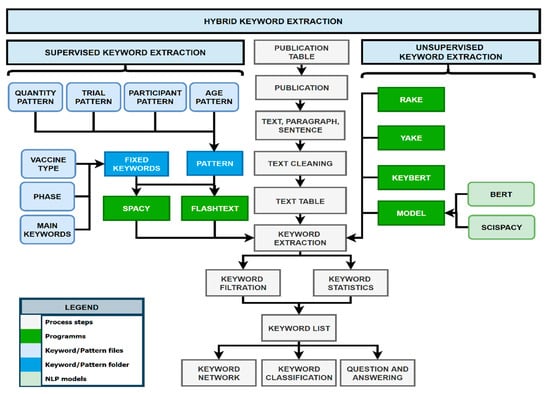 The KnowVID-19 system uses a hybrid keyword extraction approach (see Figure 6) that combines machine learning and NLP techniques to identify relevant keywords from the collected data. This AI-powered approach enables the system to extract keywords and provide a comprehensive knowledge base for researchers and medical professionals.
