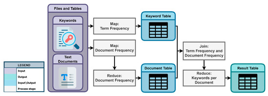 After the keyword generation process, KnowVID-19 employs the Term Frequency (TF) and Document Frequency (DF) methods to finalize the text classification process. Figure 7 depicts the step-by-step process of employing these techniques on the given list of keywords and the text documents crawled and stored by the crawler.