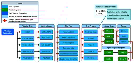 The network generation process is used to visualize the generated keywords for multiple given topics and subtopics. To create a network, the topic that needs to be explored must be first defined (e.g., Vaccine). Identifying all subtopics related to the topic is the next step of the network generation process. The subtopics of the topic “Vaccine” may include “Vaccine Type”, “Vaccine Name”, and “Trial Type” (see Figure 8). After these topics have been identified, they are ranked by priority on a list.