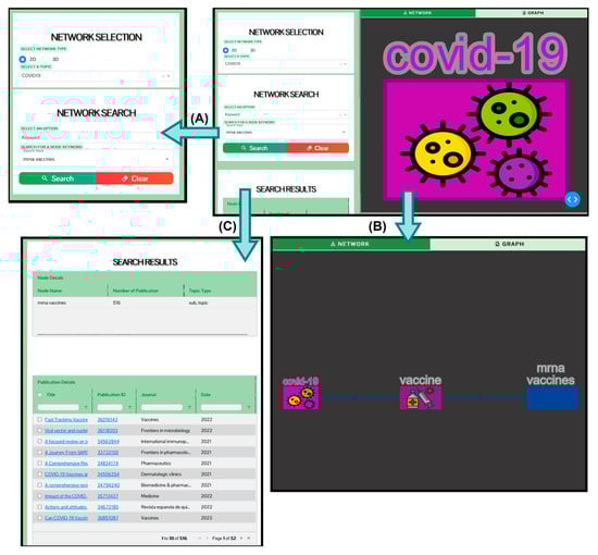 As a response to the input data introduced in the search field on the KnowVID-19 website (Figure 9B), the visualized network subgraph focuses on the connection between COVID-19 and vaccination, and expands with new vaccination-related topics, represented as nodes. In general, the visualized network subgraph is generated with Cytoscape using all the keywords that relate to the input keyword(s). The KnowVID-19 website represents the keywords as nodes of a network graph. The edges represent the connection with other related keywords.