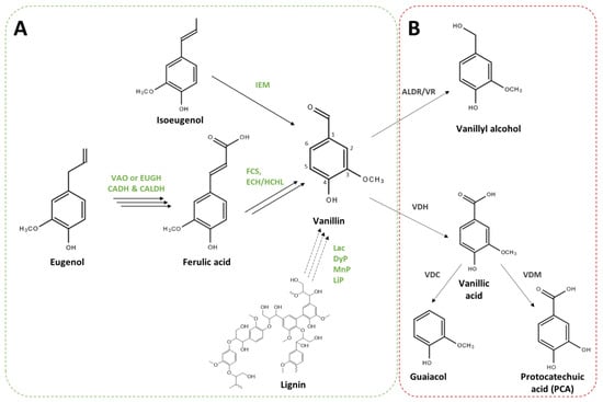 Genes and enzymes involved in vanillin biosynthesis from phenolic compounds have been characterised in some microorganisms (Figure 2A). Isoeugenol is readily transformed into vanillin through an epoxide-diol pathway by an isoeugenol monooxygenase (gene name: iem, enzyme name: IEM) that was found in some Pseudomonas strains [49,50,51]. Genes encoding the enzymes involved in the eugenol bioconversion pathway were first identified in Pseudomonas sp. HR199 [52]. The transformation of eugenol into ferulic acid comprises three steps: (1) the heterodimeric eugenol hydroxylase (ehyA, ehyB, EUGH) catalyses the oxidation of eugenol into coniferyl alcohol [52], and this reaction can also be catalysed by a vanillyl alcohol oxidase (vaoA, VAO) [53]; (2) and (3) coniferyl alcohol is then oxidised into coniferyl aldehyde and subsequently into ferulic acid by coniferyl alcohol and coniferyl aldehyde dehydrogenases (calA and calB, CADH and CALDH) [54]. Ferulic acid can then be catabolised by microorganisms, and vanillin is obtained as an intermediate of the catabolic route. Five different ferulic acid catabolic pathways have been proposed in various microorganisms [2,8,11]. The most efficient for vanillin production is the non-β-oxidative deacetylation (CoA-dependent) route (Figure 2A), which requires two enzymes, a feruloyl-CoA synthetase (fcs, FCS) and an enoyl-CoA hydratase/4-hydroxycinnamate CoA-hydratase/lyase (ech, ECH/HCHL). Genes and enzymes involved in this pathway have been identified and characterised in Pseudomonas [55] and Amycolatopsis strains [35]. Finally, several microorganisms, including fungi and soil bacteria, have been studied for their ability to degrade lignin and produce vanillin [56]. However, genes and enzymes involved in this bioconversion have yet to be fully characterised [57].