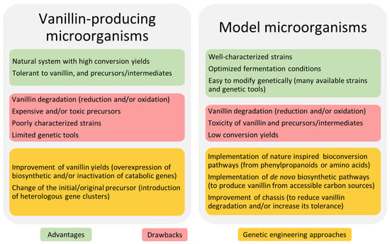 Bio-vanillin can be produced by vanillin-producing or model microorganisms. The advantages and drawbacks of each host chassis for vanillin biosynthesis are summarised in Figure 3. On the one hand, vanillin-producing microorganisms can efficiently produce vanillin and are highly tolerant to vanillin, to the precursors commonly used, and the biosynthetic intermediates. These strains contain the bioconversion pathways for vanillin synthesis from eugenol, isoeugenol, and/or ferulic acid. Vanillin-producing strains used for the industrial bioconversion of ferulic acid into vanillin are not laboratory strains. Most of the time, efficient genetic tools are lacking or limited, hampering their genetic manipulation [60,64]. Moreover, little is known about the native metabolic pathways in which the vanillin biosynthetic genes are involved or the regulation of their expression in these microorganisms [65,66].