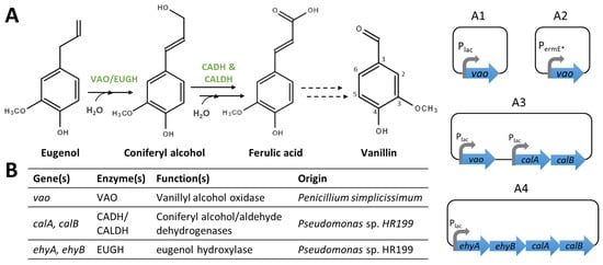 Genetic engineering approaches allowing the use of eugenol as a precursor of ferulic acid for vanillin bioproduction. (A) Schematic representation of the biosynthetic pathway and the applied constructions. (B) Table summarising the function and origin of the genes/enzymes used.