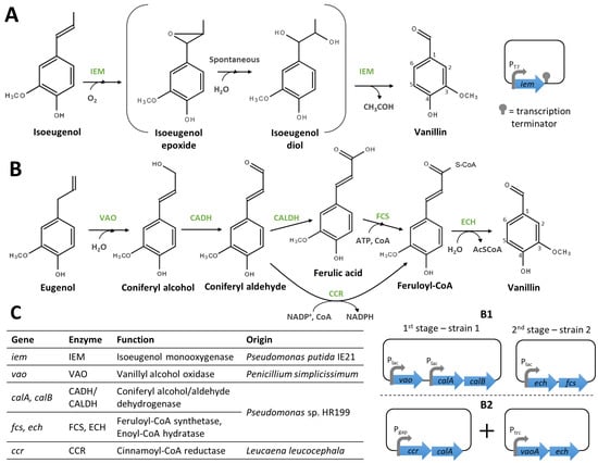 The second approach to the microbial production of vanillin involves the introduction of the vanillin biosynthetic pathway in model microorganisms. When considering the implementation of phenylpropanoid bioconversion pathways, Escherichia coli has served as the primary chassis microorganism. During the past two decades, a number of engineered E. coli strains have been developed to produce vanillin from eugenol, isoeugenol, or ferulic acid.