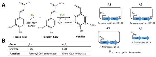 In Amycolatopsis strains, the optimisation of vanillin production has also been achieved by the overexpression of the genes involved in bioconversion (Figure 4). For instance, the introduction of additional copies of ech and fcs under the control of the ermE* promoter into the genome of Amycolatopsis sp. ATCC 39116 [70] or Amycolatopsis sp. ZYL926 [71] resulted in an increase in vanillin production (A2 in Figure 4). Moreover, a recent patent application described an increase in vanillin production from ferulic acid following the inactivation of a gene encoding a ROK-family transcriptional regulator (ROK-TR1) in Amycolatopsis sp. HM-141 [72]. This regulator might repress, directly or indirectly, the transcription of the genes involved in vanillin biosynthesis, as its overexpression reduces vanillin production compared to the wild-type strain.