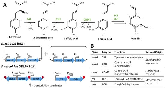 Inspired by the proposed vanillin biosynthetic pathways occurring in Vanilla and in vanillin-producing microorganisms, some researchers reported the use of synthetic biology approaches to produce, in model microorganisms, vanillin from aromatic amino acids, which have a lower price and higher availability than ferulic acid. For instance, Ni et al. [94] produced vanillin from accessible carbon sources in E. coli by mimicking the ferulate pathway (Figure 9). They assembled a vanillin biosynthetic pathway, previously proposed in an iGEM project [95], comprising five enzymes: TAL, C3H, OMT, FCS, and ECH. In this work, the authors tested two candidate genes encoding enzymes catalysing the conversion of tyrosine to 4-coumaric acid (RsTAL and sam8) and 4-coumaric acid to caffeic acid (hpaBC and sam5). Here, only the constructions giving the best vanillin yields are described. The sam8 and sam5 genes (from Saccharothix espanensis) were cloned in pACYC-Duettogether with a comt synthetic gene (codon-optimised for E. coli) encoding the caffeic acid O-methyltransferase (COMT) from Arabidopsis thaliana. The ech and fcs genes were amplified from the genomic DNA of Streptomyces sp. V-1 and cloned into pET-Duet with an extra copy of sam5. The introduction of both vectors in E. coli BL21 (DE3) allowed the production of 97 mg/L of vanillin from tyrosine (Figure 9A) [94]. Moreover, the introduction of the same genes in a tyrosine overproducing strain yielded 19 mg/L of vanillin from glucose, 13 mg/L from xylose, and 25 mg/L from glycerol [94].
