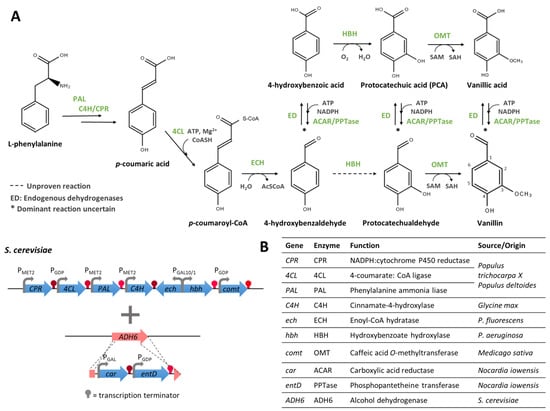 Genes encoding the required enzymes were assembled as monocistronic units (i.e., each gene under the control of an inducible promoter and followed by a terminator) in S. cerevisiae, yielding the Y00VAN-engineered strain. Such an engineered strain was cultivated under the required inducing conditions and with the addition of phenylalanine as a precursor, which led to 4-coumaric acid, 4-hydroxybenzoic acid, PCA, and vanillic acid being detected in the culture supernatants, but the corresponding aldehydes were not detected [97]. To deal with the undesired oxidation of vanillin and its intermediates (aldehydes) into the corresponding acids, the inventors proposed the replacement of the ADH6 gene by car and entD genes from Nocardia. These two genes encode an aryl aldehyde carboxylic acid reductase (ACAR, catalysing the reduction of vanillic acid into vanillin) and a phophopantetheinyl transferase (PPTase, responsible for the phosphopantetheinylation of ACAR). The ability of the yeast strain (YOCPVAN) harbouring these heterologous genes to produce vanillin when fed with phenylalanine was not demonstrated [97]. A patent application from Rhodia operations [102] later confirmed the involvement of the host strain endogenous enzyme(s) for the conversion of 4-hydroxybenzaldehyde into 4-hydroxybenzoic acid and described that the engineered strain could produce only 1 µM of vanillin from endogenous phenylalanine.
