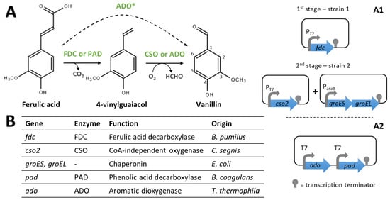 In this context, Furuya et al. [103] reported the introduction of a de novo biosynthetic pathway in E. coli to produce vanillin from ferulic acid via a CoA-independent route (Figure 11). Here, ferulic acid is first converted to 4-vinylguaiacol by a CoA-independent ferulic acid decarboxylase (FDC), which is then transformed into vanillin by a carotenoid oxygenase (CSO). In this study, 6.8 mM of vanillin was synthetised from 10 mM of ferulic acid using an E. coli strain expressing the genes fdc and cso2. Moreover, researchers demonstrated that the optimal conditions for both reactions are largely different [103]. Later on, the same group obtained a yield of 52 mM of vanillin (from 75 mM of ferulic acid) in a two-stage process using two recombinant E. coli BL21 (DE3) (Figure 11(A1)) [104]. The first recombinant strain, harbouring the fdc gene from Bacillus pumilus under the control of the T7 promoter, completely converted the ferulic acid into 4-vinylguaiacol. The second one, expressing the cso2 gene (from Caulobacter segnis) and overexpressing chaperonins, converted a maximum of 69% of 4-vinylguaiacol into vanillin when the reaction was carried out in a biphasic system to avoid substrate and product toxicity [104]. The co-overexpression of the groES and groEL genes (encoding the chaperonin GroEL and the cochaperonin GroES) was required to efficiently produce CSO as a soluble protein [103].