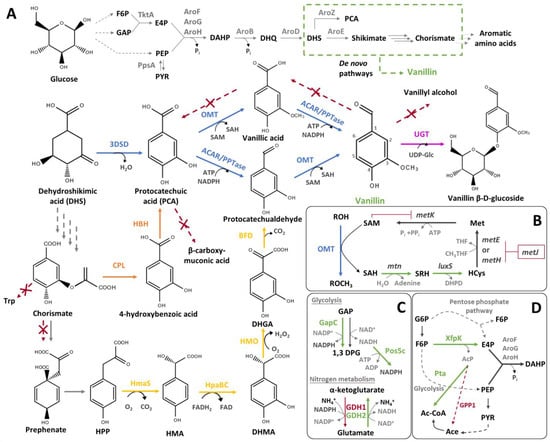Vanillin production from glucose by de novo biosynthetic pathways. (A) Vanillin biosynthetic pathways. The arrows representing the reactions are coloured as follows: grey—primary metabolism (e.g., shikimate pathway); blue—conversion of dehydroshikimic acid into vanillin; orange—conversion of chorismate into protocatechuic acid; yellow—conversion of hydroxyphenylpyruvate into protocatechualdehyde; and magenta—conversion of vanillin in vanillin glucoside. Green arrows and enzyme names indicate that the enzymes catalysing the reactions are overexpressed in optimised chassis. Red dotted arrows marked with an X and red enzyme names indicates that the enzyme catalysing the reactions are absent in optimised chassis, following the inactivation of the endogenous genes encoding the corresponding enzymes. (B) Strategies to improve the SAM supply for methylation step. (C) Modified steps of glycolysis or nitrogen metabolism to improve the NADPH supply. (D) Strategies to improve the E4P precursor supply. For panels B, C, and D, the green and red arrows and protein names are used, as in panel A, to indicate overexpression or absence, respectively. Abbreviations of metabolites: Ac-CoA—Acetyl-Coenzyme A; Ace—Acetate; AcP—acetyl phosphate; DAHP—3-deoxy-D-arabino-heptulosonate-7-phosphate; DHGA—3,4-dihydroxyphenylglyoxylate; DHMA—3,4-dihydroxymandelate; DHQ—3-dehydroquinic acid; DHS—3-dehydroshikimic acid; 1,3DPG—3-phospho-D-glyceroyl-phosphate; E4P—erythrose-4-phosphate; F6P—fructose 6-phosphate; GAP—D-glyceraldehyde 3-phosphate; G6P—glucose 6-phosphate; HCys—homocysteine; HMA—hydroxymandelate; HPP—hydroxyphenylpyruvate; Met—Methionine; PEP—phosphoenolpyruvate; Pyr—pyruvate; SAH—S-adenosyl-L-homocysteine; SAM—S-adenosylmethionine; SRH—S-ribosyl-L-homocysteine; Trp—Tryptophan. Abbreviations of proteins: ACAR—Aromatic carboxylic acid reductase; AroB—DHQ synthase; AroD—DHQ dehydratase; AroE—Shikimate dehydrogenase; AroF, AroG, AroH—DAHP synthase feedback-regulated isoenzymes; AroZ, 3DSD—3-dehydroshikimate dehydratase; BFD—Benzoylformate decarboxylase; CPL—Chorismate-pyruvate lyase; GapC—GAP dehydrogenase; GDH1/GDH2—NADP+/NAD+-dependent glutamate dehydrogenases; GPP1—glycerol-1-phosphate; HBH—Hydroxybenzoate hydroxylase; HmaS—Hydroxymandelate synthase; HMO—Hydroxymandelate oxidase; HpaBC—Two-component flavin-dependent monooxygenase; LuxS—S-ribosylhomocysteine lyase; MetE, MetH—Methionine synthases; MetJ—transcription regulator of methionine biosynthetic gene cluster; MetK—SAM synthetase; Mtn—5′-methylthioadenosine/S-adenosylhomocysteine nucleosidase; OMT—O-methyltransferase; PDC1—pyruvate decarboxylase; Pos5c—cytosol-relocalised NADH kinase; PpsA—phosphoenolpyruvate synthase; PPTase—Phosphopantetheine transferase; Pta—phosphotransacetylase; TktA—Transketolase; UGT—UDP-glycosyltransferase; Xfpk—phosphoketolase.