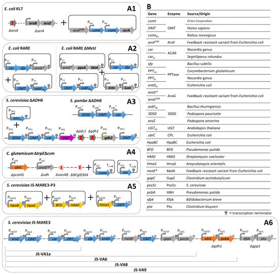 Implementation of de novo biosynthetic pathways to produce vanillin from glucose in different model chassis. (A1–A6) Schematic representation of the genetic constructions used to implement these pathways. Different transcriptional terminators are represented by different colors. Coloured arrows represent genes encoding enzymes involved in different metabolic steps. Blue—conversion of dehydroshikimic acid into vanillin; Orange—conversion of chorismate into protocatechuic acid; Yellow—conversion of HPP into protocatechualdehyde; Magenta—conversion of vanillin in vanillin glucoside; Grey—genes involved in primary metabolism which are overexpressed for chassis optimisation; Red rectangle within an arrow or ∆—endogenous genes deleted for chassis optimisation; (B) Table summarising the origin of the heterologous genes. List of genes deleted in model microorganisms to improve vanillin production: adh6—alcohol dehydrogenase; aroE—shikimate dehydrogenase; gdh1—glutamate dehydrogenase I; gpp1—glycerol-1-phosphatese; MARE—multiple-aldehyde reductases; metJ—transcription regulator of methionine biosynthetic cluster; NCgl0324—aromatic aldehyde reductase; pcaHG—protocatechuate dioxygenase; pdc1—pyruvate decarboxylase; serA—phosphoglycerate dehydrogenase; RARE—multiple-aldehyde reductases; trpE—anthranilate synthase; csm—chorismate mutase; vdh—vanillin dehydrogenase; vanAB—vanillate demethylase. List of endogenous genes overexpressed (in bold) for chassis optimisation: aroB—DHQ synthase; aroZ—3-dehydroshikimate dehydratase; gdh2—glutamate dehydrogenase II; luxS—S-ribosylhomocysteine lyase; mtn –5′-methylthioadenosine/S-adenosylhomocysteine nucleosidase; ppsA—phosphoenolpyruvate synthase; serA—phosphoglycerate dehydrogenase; tktA—transketolase.
