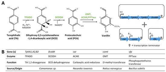A circular economy aims at minimising adverse environmental impacts of manufacturing. In this context, the use of plastic waste to obtain value-added products has attracted significant attention in recent years [117,118]. Polyvinyl alcohol and polyethylene terephthalate (PET) are polymers with widespread applications (e.g., textile industry, pigment binder, and plastic bottle production). However, these polymers are important pollutants and new methods to degrade and valorise them are required for an efficient circular economy [117,118]. Mejia et al. [119] have identified a possible enzyme implicated in the bioconversion of polyvinyl alcohol to vanillin by Phanerochaete chrysosporium. Recently, Sadler and Wallace [120] reported the development of an engineered E. coli for the direct bioconversion of terephthalic acid (TA), a PET-derived monomer, into vanillin. To this end, they implemented in E. coli RARE a de novo pathway comprising four steps (Figure 14). First, the thpA1, tphA2, tphB2, and dcddh genes, encoding the enzymes involved in the conversion of TA into PCA, were assembled in a single operon under the control of the T7 promoter in pET21. The comt and car genes, required for the transformation of PCA to vanillin, were each cloned under the control of the T7 promoter in pRSF-Duet. In addition, a third plasmid comprising the sfp gene, encoding a PPTase, was constructed [120]. Cells co-transformed with all three vectors (Figure 14) produced 0.76 mg/L of vanillin from 5 mM of TA. After extensively optimising the bioconversion conditions (such as the culture media, pH, temperature, and the addition of the cofactor’s precursors), a maximum vanillin titre of 119 mg/L was obtained [120].