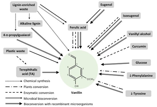 While, according to US food regulation, vanillin produced from a natural precursor by chemical synthesis is considered a “natural flavour” (FDA 101.22), by the European food regulation, the label “natural flavour” requires natural precursors and enzymatic or fermentative transformation processes (UE 1334/2000). “Natural vanillin flavour” has an intermediate price (roughly ten times more than chemically synthesised vanillin, but ten times less than natural vanilla extract), and its market share is around 9% of the global vanillin market. The increasing demand for environmentally friendly processes and for “natural flavours” has led to the development of biotechnological processes for the bioproduction of vanillin at the industrial level [2]. The demand for vanillin produced by biotechnological processes, also called bio-vanillin, has increased, so manufacturers are expanding their production capacity and developing new strains and production processes [5].