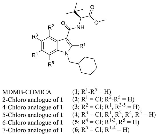 To this end, five chloroindole analogues of 1, 2-Cl- (2), 4-Cl- (3), 5-Cl- (4), 6-Cl- (5), and 7-Cl-MDMB-CHMICA (6) (Figure 1) were synthesized, characterized by UV/VIS, IR, NMR spectroscopy and mass spectrometry. Particular attention was given to the discriminatory power of each technique, similar to studies from the group of Clark et al. [,]. Additionally, the hCB1 receptor affinity of the five compounds was tested in order to obtain relevant information for forensic toxicology, which is needed to understand which compounds are more likely to become widespread on the market and in pharmaceutical disciplines.